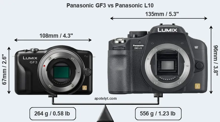 La Panasonic Lumix DMC-GF3 e la Panasonic Lumix DMC- L10 sono due fotocamere digitali rivelate al pubblico rispettivamente a giugno 2011 e agosto 2007. Il GF3 è una fotocamera mirrorless con obiettivo intercambiabile, mentre L10 è una fotocamera DSLR. Entrambe le fotocamere sono dotati di un sensore Quattro Terzi. La GF3 ha una risoluzione di 12,0 megapixel, mentre la L10 fornisce 10,0 MP.